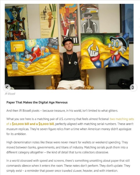 of a $10,000 bill and a $5,000 bill, perfectly aligned with matching serial numbers. These aren't