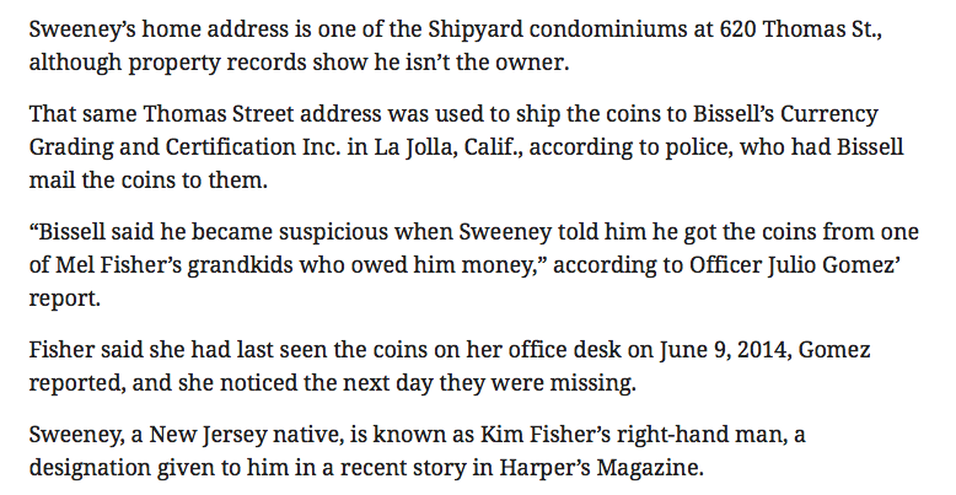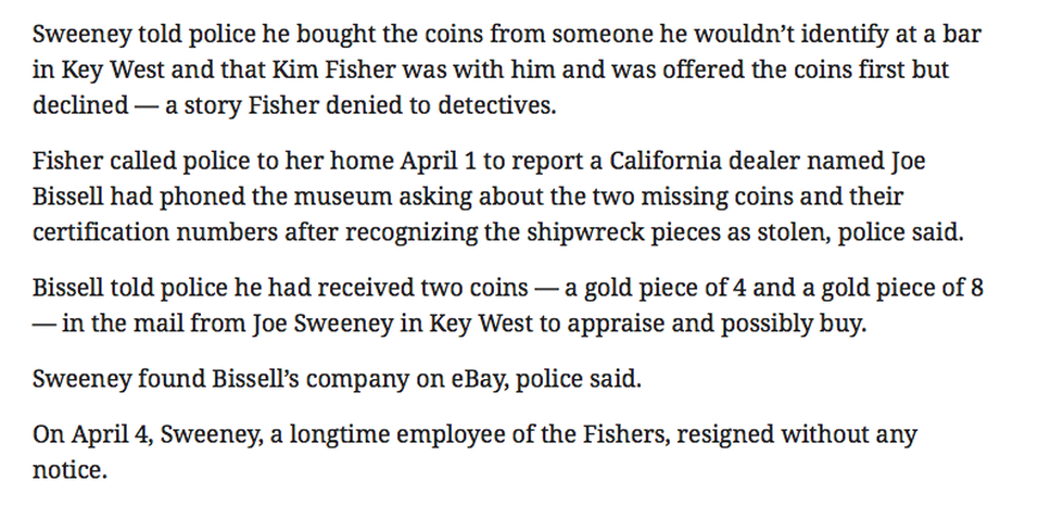 "Bissell said he became suspicious when Sweeney told him he got the coins from one