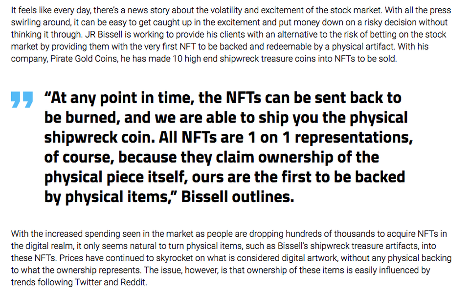 company, Pirate Gold Coins, he has made 10 high end shipwreck treasure coins into NFTs to be sold.