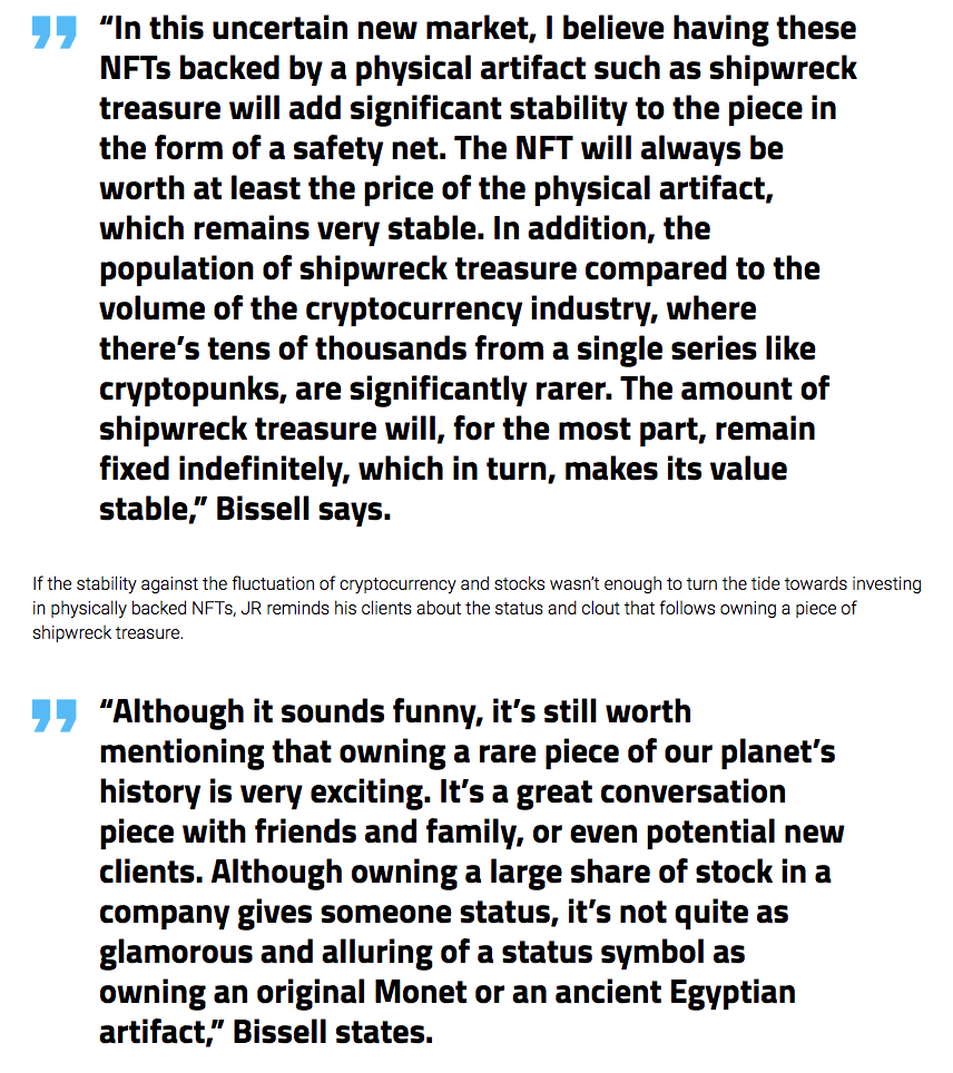 the digital realm, it only seems natural to turn physical items, such as Bissell's shipwreck treasure artifacts, into